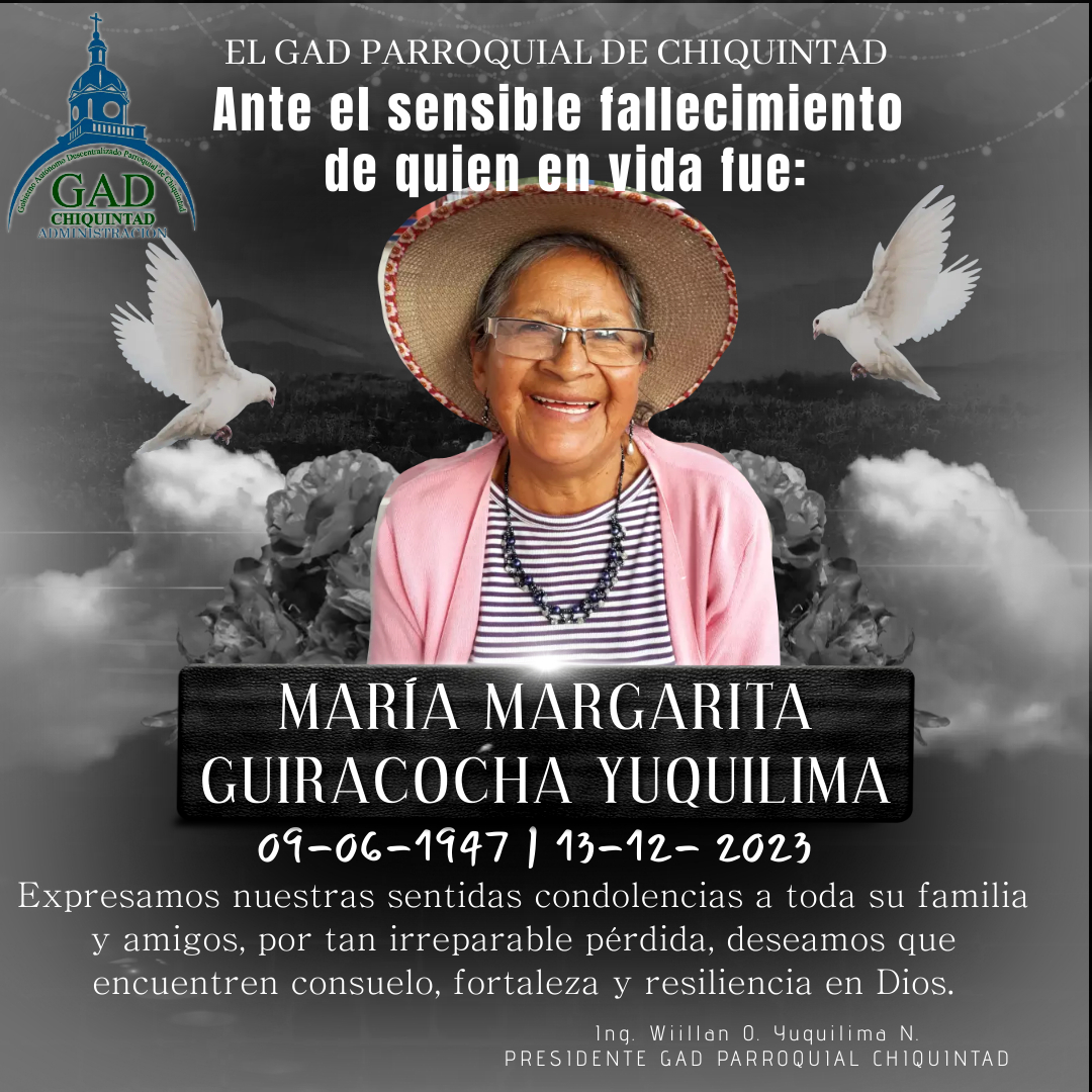 El GAD Parroquial de Chiquintad, expresa su sentimiento de solidaridad, ante el sensible fallecimiento de la Srta. María Margarita Guiracocha Yuquilima (09-06-1947 | 13-12-2023).